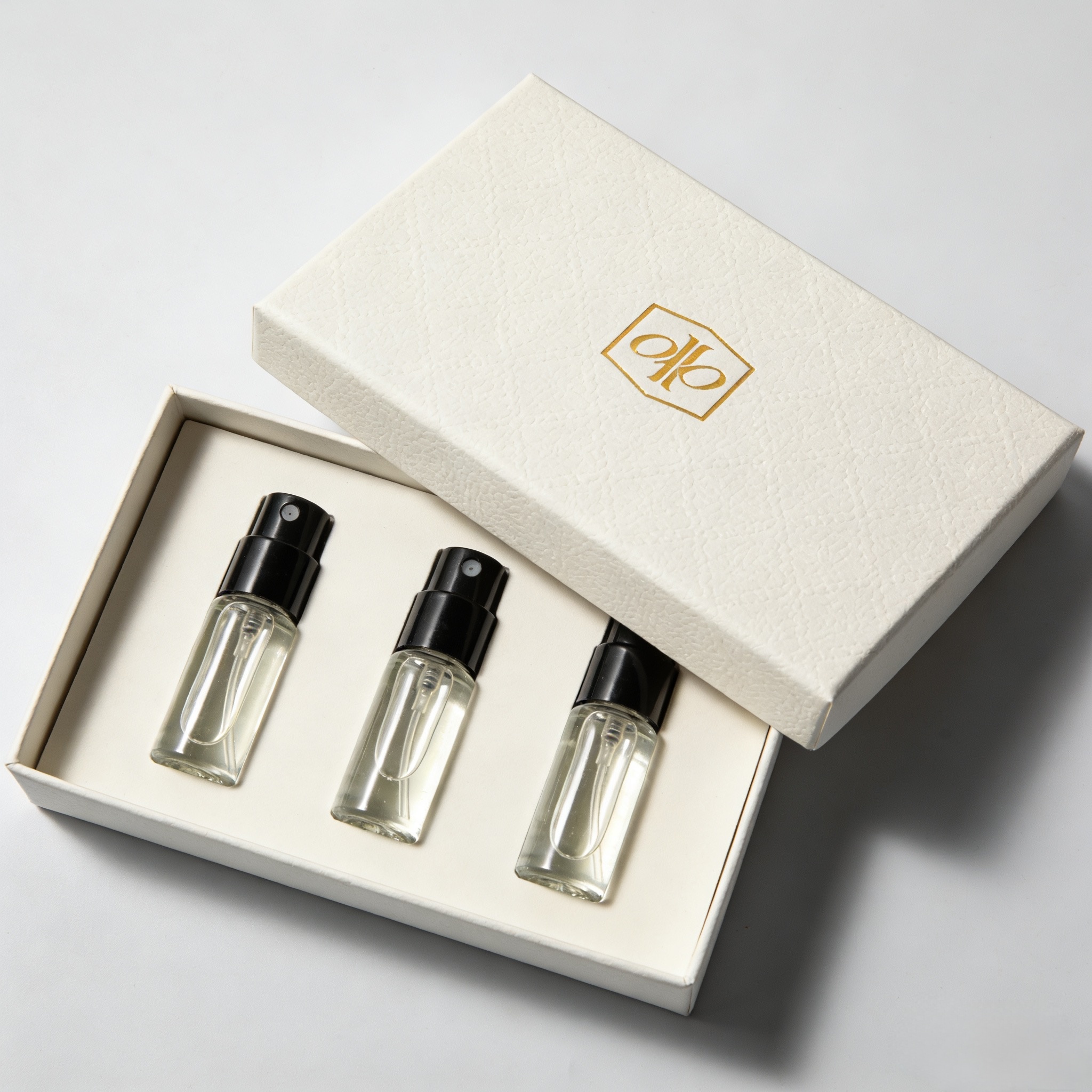 Elegant rigid perfume sample set box with textured off-white finish and gold foil logo. Features a custom insert to securely hold 3 travel-size perfume vials, ideal for fragrance discovery kits.
